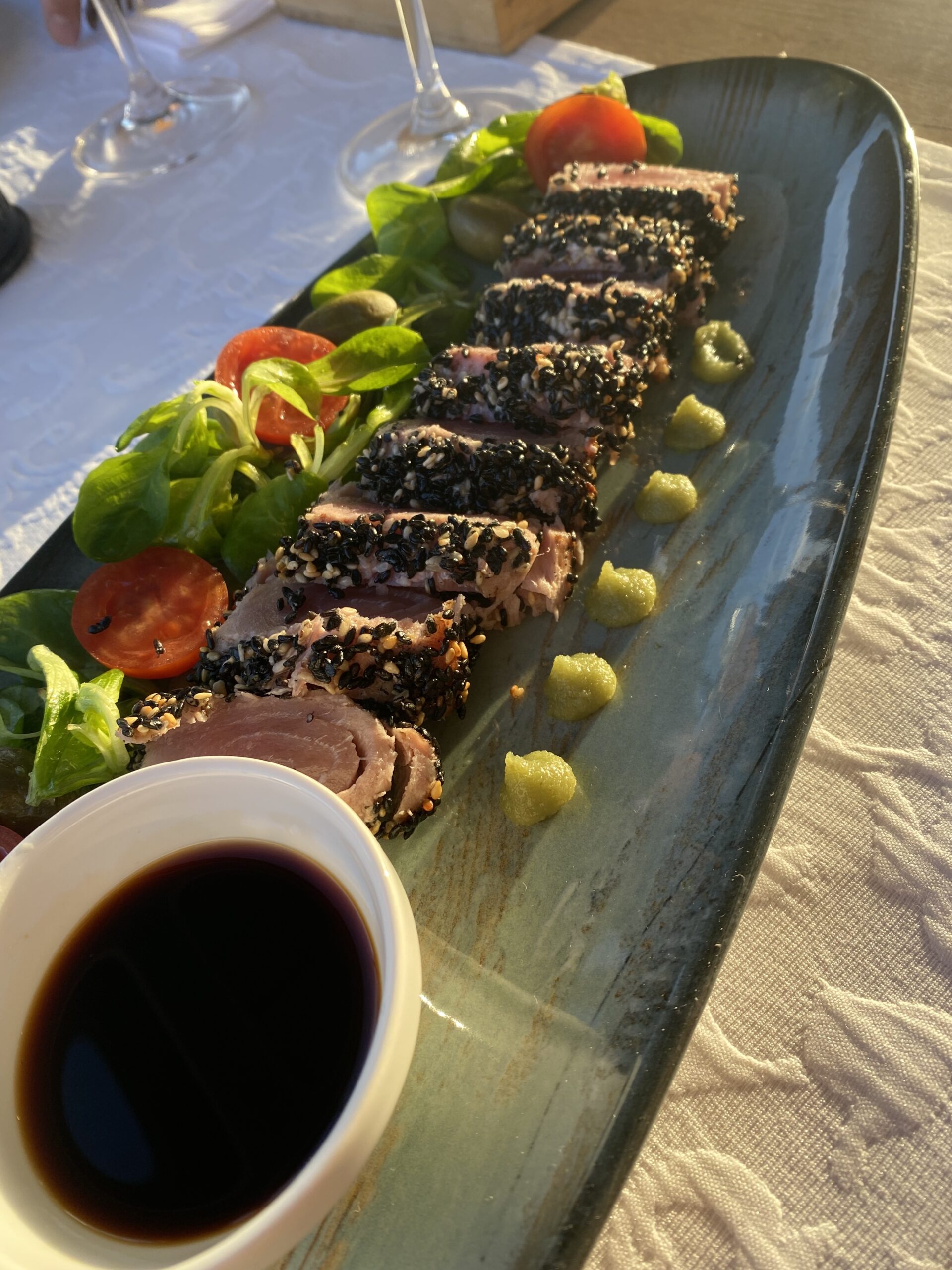 Mais voici la véritable vedette : leur spécialité maison, le plateau de fruits de mer. Il s’agit de la pêche la plus fraîche du jour, grillée à la perfection et accompagnée de légumes de saison cueillis dans les jardins locaux. Et ne me parlez pas de leur huile d’olive maison – j’ai peut-être « accidentellement » trempé beaucoup trop de pain dedans !