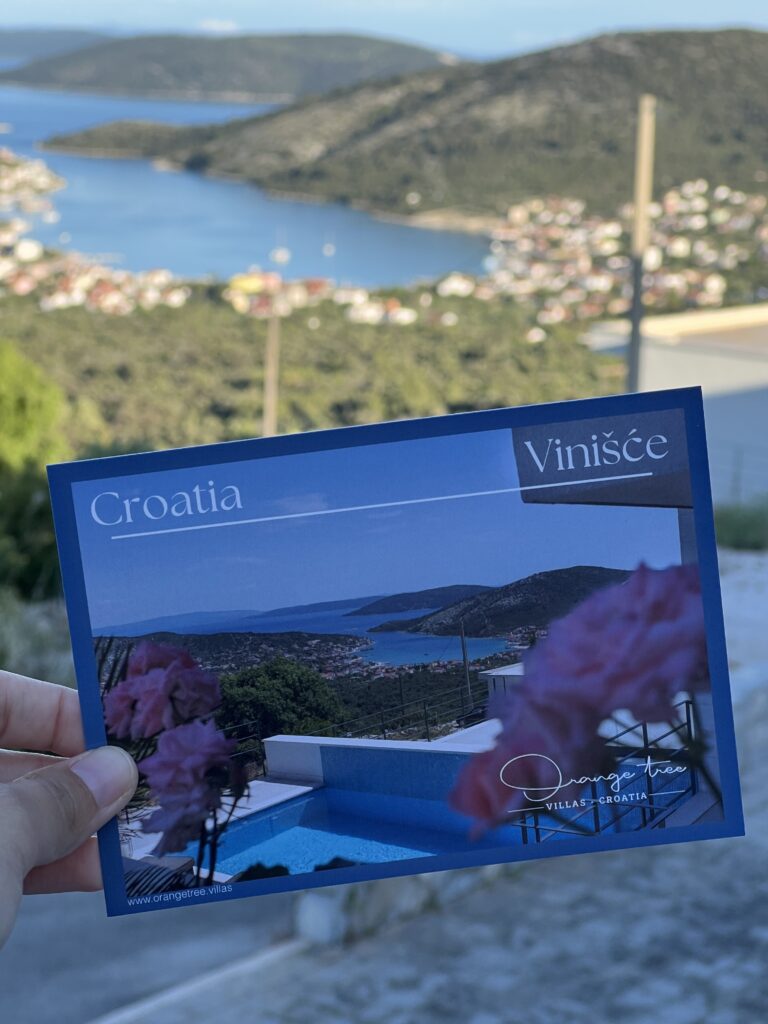 Dans un monde où la plupart des messages sont envoyés instantanément sur nos téléphones, écrire une carte postale rappelle un autre type de souvenir de voyage. C’est un petit moment pendant les vacances – assis sur la terrasse, profitant du soleil, et écrivant quelques lignes sur les belles journées passées à Vinišće, près de Trogir et de la côte dalmate.